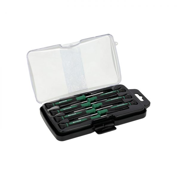 Wkrętaki precyzyjne STALCO zostały wykonane z myślą o trwałości i żywotności. Do ich produkcji zastosowano stal chromowo-wanadową o bardzo dużej wytrzymałości na pękanie i uszkodzenia mechaniczne. Ergonomiczne uchwyty z tworzywa sztucznego także są odporne na pękanie i uszkodzeni. Wszystkie wkrętaki znajdują się w poręcznym opakowaniu z tworzywa sztucznego. Dzięki temu łatwiej można utrzymać je w porządku i zapobiec zagubieniu w warsztacie.